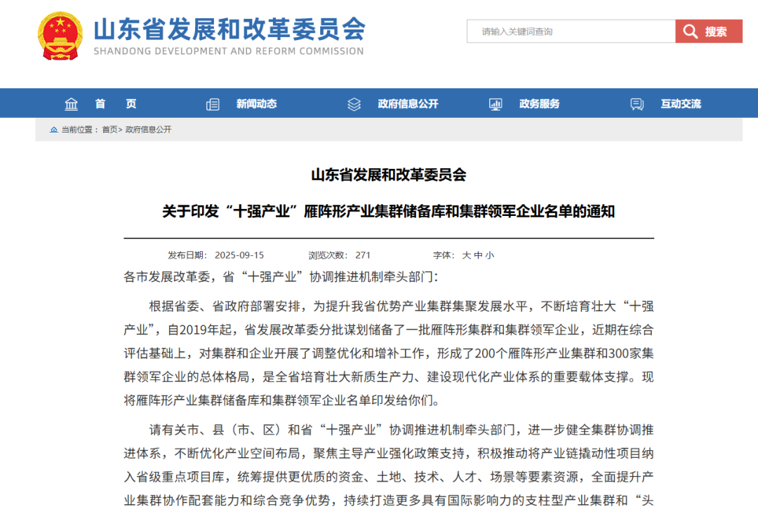 9月15日,山东省发展和改革委员会公布了《关于印发“十强产业”雁阵形产业集群储备库和集群领军企业名单的通知》,亚太森博(山东)浆纸有限公司入选山东省“十强产业”集群领军企业,以亚太森博为支柱的日照浆纸一体化产业集群新入选2025年度省“十强产业”雁阵形产业集群。